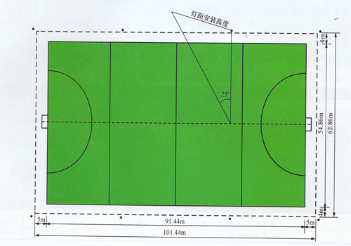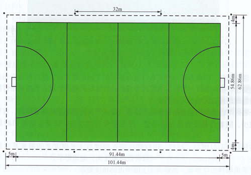 曲棍球場地四周設有無障礙區(qū),在障礙區(qū)域內絕對不允許裝設燈桿,燈塔。無障礙區(qū)域最小為:距兩底線5m,距兩邊線4m。