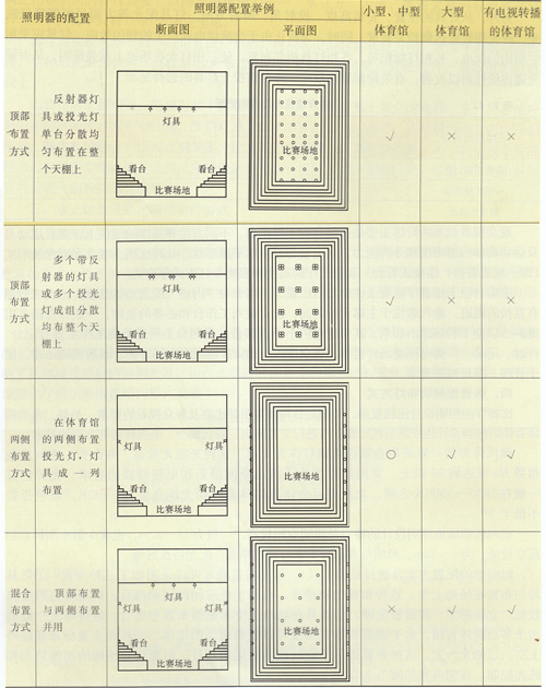 2. 燈具在場(chǎng)地上空和側(cè)面布置相結(jié)合。這種布置一般適用于多功能體育館,水平照度和垂直照度可以獲得適當(dāng)?shù)谋嚷省?/span>