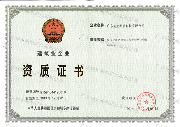 12月初,在廣東城鄉(xiāng)及住房建設(shè)廳領(lǐng)導(dǎo)的大力堅(jiān)持下,經(jīng)國(guó)家住房和城鄉(xiāng)建設(shè)部審查核準(zhǔn),揚(yáng)光照明取得“城市及道路照明工程專業(yè)承包壹級(jí)資質(zhì)”。