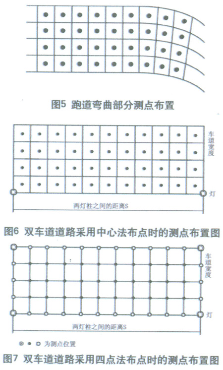 照度測量的范圍,在縱方向(沿道路走向)應(yīng)包括同一側(cè)的兩個(gè)燈桿之間的區(qū)域;而在橫方向,單側(cè)布燈時(shí)應(yīng)為整個(gè)路寬;雙側(cè)交錯布燈、對稱布燈或中心布燈時(shí)可為1/2路寬。