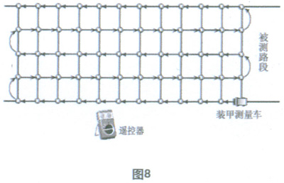 本方案是將具有記憶和存貯功能的TES-1333型照度記安置在高檔電動遙控的履帶式玩具裝甲車(以下簡稱為測試小車)上,該測試小車的驅(qū)動系統(tǒng)受站在路邊的測量者手中的遙控器和測試小車內(nèi)安置的可編程控制器為主體的自動控制系統(tǒng)控制,當(dāng)車內(nèi)的自動控制系統(tǒng)啟動時(shí),裝甲車將按照事先設(shè)定的動作程序沿如圖8所示的箭頭方向完成行走程序,并采用四點(diǎn)法在每個(gè)矩形網(wǎng)格的四角處自動完成照度測量和記錄,存貯任務(wù),待全部程序結(jié)束后,測試小車在遙控器的操縱下自動返回測量者所在位置。遙控器的另一作用是在車內(nèi)控制系統(tǒng)失靈的情況下,由測量者手動遙控完成全部的測量過程,并在道路出現(xiàn)行駛車輛時(shí)緊急召回測試小車。