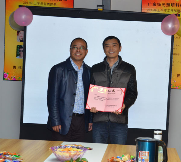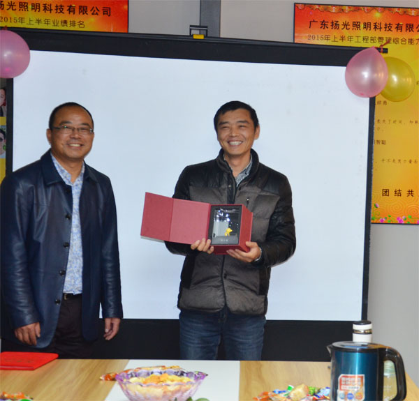 揚光照明每年都要為跨進10年工齡的老員工舉行表彰儀式,并授予榮譽獎章。你看,今年就有一位,他,就是我們公司的工程部總監(jiān)——郭總。