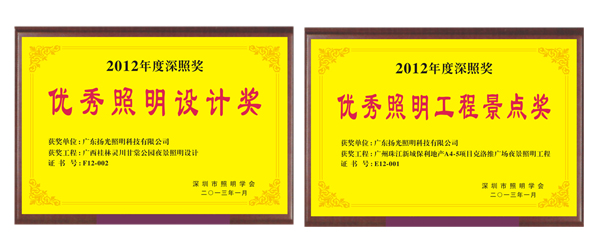 2013年1月6日,由深圳市照明學(xué)會和深圳市照明電器行業(yè)協(xié)會根據(jù)深圳市照明行業(yè)發(fā)展共同設(shè)立的深照獎舉行了頒獎,揚光照明囊獲優(yōu)秀照明工程景點獎和優(yōu)秀照明設(shè)計獎兩項大獎。