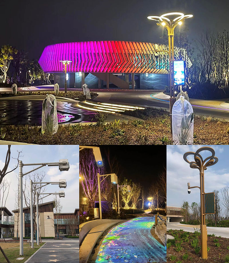 ”智慧城市,智慧照明“在項目中亦多處使用,功能照明上,各地塊均使用非標定制的智慧燈桿,實現(xiàn)園區(qū)監(jiān)控、信息投播、語音廣播、功能照明、WiFi傳播、一鍵報警等一體化智慧科技,智能城市系統(tǒng)化。