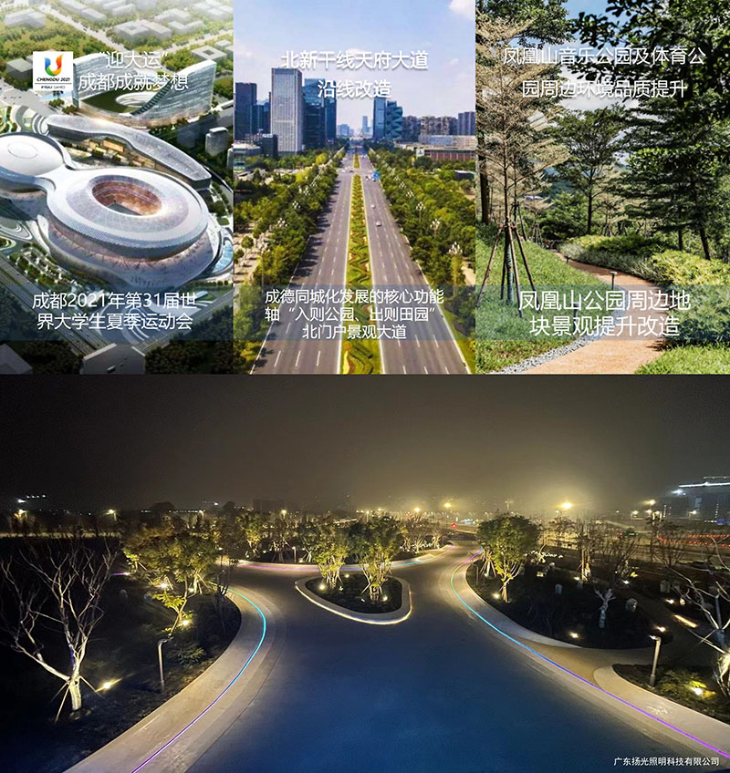 北星大道是成都向北聯(lián)系德陽的主軸,也是2021世界大學(xué)生運動會的重要賽區(qū)所在地。而整個片區(qū)夜晚環(huán)境不足以表達區(qū)域特色,因此對北星大道兩側(cè),鳳凰山露天音樂公園及國際足球中心周邊場景進行整治,既是大運會期間的風(fēng)貌展示,也是城市發(fā)展的重要需要。
